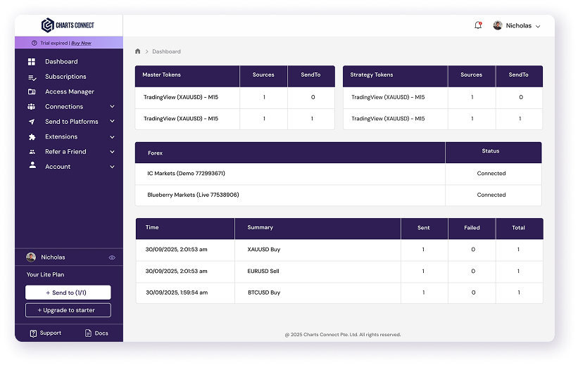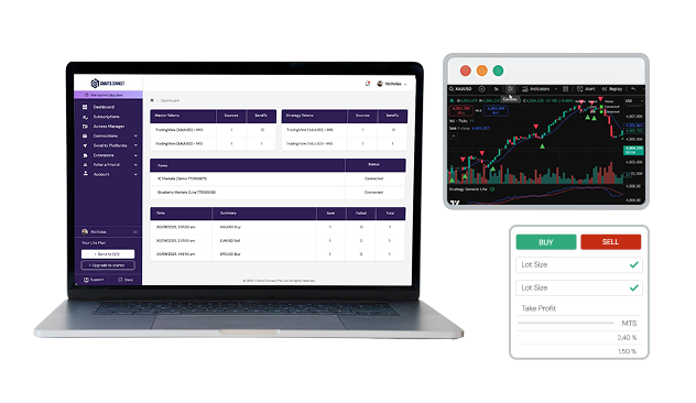 Connect your charts to your preferred broker or exchange. Your trades execute instantly — no human error, no delay. See how your Algo profits in real time, with integrated features to manage it all.